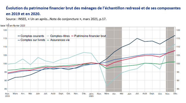 L’INSEE a publié, en 2021, une note dressant le bilan économique un an après le début de la crise sanitaire. Les ménages (plus encore ceux du secteur public) ont accru leur épargne, mais les sommes accumulées n’ont que peu alimenté les placements de long terme.